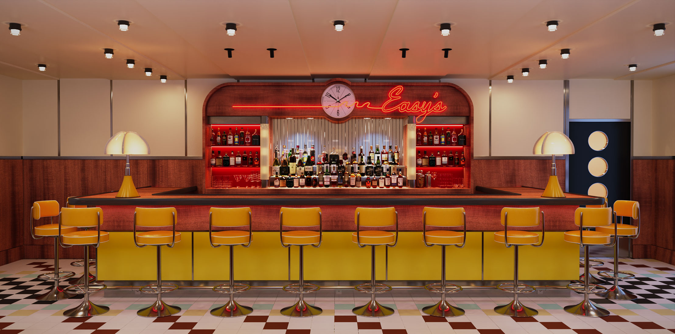 Inspired by the streamline architecture of Miami Beach and 1960’s European cafe culture, the design fuses styles blending traditional with the contemporary to create a universe that is both carefree and graphic. At the intimate indoor bar, reflective stainless steel accentuates figured wood wall panels; glass block catalyzes neon illumination and movement; and a playful floor pattern recalls classic diners. Cozy banquettes provide comfort and ease after a long day and accents of yellow keep the rhythm of good times high on the Miami skyline. The outdoor rooftop dining areas take a similar approach with original takes on classic patterns – stripes in idiosyncratic layouts on the awning, picnic blanket-inspired fabrics at the banquettes – mixed with quintessential deco materials, like terrazzo, in large format checkerboard paving pattern. The dining tables are a feature to the outdoor experience – durable enamel tops are decorated in classic game motifs inviting guests to gather and play. Every touchpoint is designed around simplicity, clarity and comfort. Open Summer 2026.